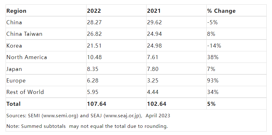 2022ÄêÈ«Çò°ëµ¼ÌåÉ豸³ö»õ½ð¶îÔÙÁ¢Òì¸ß£¬µÖ´ï1076ÒÚÃÀÔªÐû²¼Ê±¼ä£º2023-04-27 22:40À´Ô´£ºÖйúµç×Ó±¨¡¢µç×ÓÐÅÏ¢¹¤ÒµÍø ½üÈÕ£¬SEMIÐû²¼µÄ¡¶È«Çò°ëµ¼ÌåÉ豸Êг¡±¨¸æ¡·Ö¸³ö£¬2022ÄêÈ«Çò°ëµ¼ÌåÖÆÔìÉ豸³ö»õ½ð¶îÏà½ÏÓÚ2021ÄêµÄ1026ÒÚÃÀÔªÔö³¤5%£¬´´ÏÂ1076ÒÚÃÀÔªµÄÀúʷиߡ£ ËäÈ»2022ÄêÖйú´ó½µÄ°ëµ¼ÌåÉ豸Ͷ×ʶîͬ±È·Å»º5%£¬Îª283ÒÚÃÀÔª£¬µ«ÒÀ¾ÉÁ¬Ðø3Äê³ÉΪȫÇò×î´óµÄ°ëµ¼ÌåÉ豸Êг¡¡£Öйų́ÍåµØÇøÁ¬ÐøµÚËÄÄêÎȶ¨Ôö³¤£¬ÅÅÃûÉÏÉýÖÁµÚ¶þ£¬2022ÄêÔö³¤8%£¬µÖ´ï268ÒÚÃÀÔª¡£º«¹úÔòÒòΪ´æ´¢Ð¾Æ¬Êг¡²»¾°Æø£¬ÈýÐÇ¡¢SKº£Á¦Ê¿µÈ³§É̵ÄÉú²ú·Å»º£¬µ¼ÖÂÉ豸ÏúÊÛ¶î´ó·ùϽµ14%£¬Îª215ÒÚÃÀÔª£¬ÅÅÃûµÚÈý¡£Å·Ö޵İ뵼ÌåÉ豸Ͷ×ÊÈ´¼¤Ôö93%£¬±±ÃÀÔö³¤ÁË38%¡£ÊÀ½çÆäËûµØÇøºÍÈÕ±¾µÄÏúÊÛ¶î»®·Öͬ±ÈÔö³¤34%ºÍ7%¡£