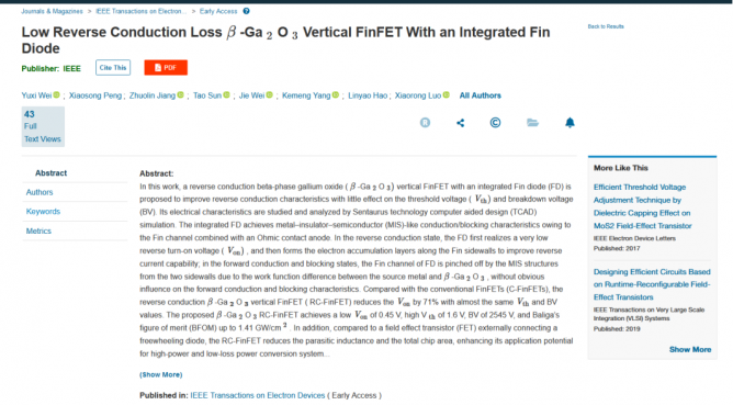 ¾ßÓм¯³É÷¢ÐͶþ¼«¹ÜµÄµÍ·´Ïòµ¼Í¨ËðºÄÑõ»¯ïØ×ÝÏòFinFETÐû²¼Ê±¼ä£º2023-06-13 21:07À´Ô´£º°ëµ¼Ìå¹¤ÒµÍø ½üÈÕ£¬µç×ӿƼ¼´óѧ¹¦Âʼ¯³É¼¼ÊõʵÑéÊÒÂÞÐ¡ÈØÍŶÓÔÚÑõ»¯ïØÆ÷¼þµÄÐøÁ÷ÄÜÁ¦·½Ìá³öÒ»ÖÖ¾ßÓеͷ´Ïòµ¼Í¨ËðºÄµÄÑõ»¯ïØ×ÝÏòFinFET£¬²¢ÒÔLow Reverse Conduction Loss ¦Â-Ga2O3 Vertical FinFET with an Integrated Fin DiodeΪÌâÔÚÏßÐû²¼ÓÚIEEE Transactions on Electron DevicesÆÚ¿¯¡£ Ñõ»¯ïØ£¨¦Â-Ga2O3£©ÓÉÓÚÆä¸ß½û´ø¿í¶È£¨4.5-4.9eV£©ºÍ¸ßÁÙ½çµç³¡£¨8MV/cm£©£¬ÓµÓбÈGaNºÍSiCÆ÷¼þ¸üÓŵÄBFOMÖµ£¬ÓÐÖúÓÚÔÚÏàͬ¶î¶¨µçѹϽµµÍ´«µ¼ËðºÄ¡£Ä¿Ç°¶ÔÑõ»¯ïس¡Ð§Ó¦¹ÜµÄÑо¿´ó¶à¼¯ÖÐÔÚÈçºÎ»ñµÃ¸ß»÷´©µçѹ(BV)ºÍãÐÖµµçѹ(Vth)ÒÔ¼°µÍ±Èµ¼Í¨µç×è (Ron,sp)ÉÏ¡£Æ¾¾Ý×î½üµÄÑо¿£¬ÔÚ¦Â-Ga2O3³¡Ð§Ó¦¹ÜÖÐÒýÈëFinͨµÀ£¬¿ÉÒÔʵÏÖ¸ßBVºÍ¸ßVth£¬µ«»áµ¼Ö·´Ïòµ¼Í¨µçѹ(Von)±ä´ó²¢ÇÒËðʧ·´Ïòµ¼Í¨¡£ µÍ·´Ïòµ¼Í¨ËðºÄÓÐÖúÓÚÊͷʦÂÊת»»ÏµÍ³ÖиÐÐÔ¸ºÔØÒýÆðµÄ¶àÓàÄÜÁ¿¡£Ê¹Ó÷´²¢ÁªÐøÁ÷¶þ¼«¹ÜÓÃÓÚ·´Ïòµ¼Í¨£¬ÄܽµµÍVon£¬µ«»áÒýÈë½Ï´óµÄ¼ÄÉúµç¸Ð²¢µ¼ÖÂÌØÁíÍ⹦ÂÊËðºÄºÍϵͳ²»Îȶ¨¡£Ê¹Óõ¥Æ¬¼¯³ÉÐ¤ÌØ»ùÊÆÀݶþ¼«¹Ü(SBD)¿ÉÒÔ¼õÉÙ¼ÄÉú²ÎÊý£¬µ«Î¶ÈÒÀÀµÐԲµ½Ä¿Ç°ÎªÖ¹£¬¶Ô¦Â-Ga2O3¹¦Âʾ§Ìå¹Ü·´Ïòµ¼Í¨ ÌØÐԵĸÄÉÆÑо¿½ÏÉÙ¡£ ±¾ÎĽéÉÜÁËÒ»ÖÖ¾ßÓм¯³É÷¢ÐͶþ¼«¹Ü£¨FD£©µÄµÍ·´Ïòµ¼Í¨ËðºÄÑõ»¯ïØ×ÝÏòFinFETнṹ£¨RC-FinFET£©£¬²¢ÀûÓÃSentaurus TCAD·ÂÕæ¶ÔÆäµçÑ§ÌØÐÔ½øÐÐÁËÑо¿ÆÊÎö¡£Èçͼ1(a)Ëùʾ£¬RC-FinFET°üÀ¨FinFET²¿·ÖºÍFD²¿·Ö£¬ÊµÏÖÀàMISµÄµ¼Í¨ºÍ×è¶ÏÌØÐÔ¡£Ê×ÏÈ£¬ÔÚÁãÆ«ÖÃÏ£¬ÓÉÓÚ½ðÊôÓë¦Â-Ga2O3µÄ¹¦º¯Êý²î£¬MIS½á¹¹µÄºÄ¾¡×÷ÓÃʹFin¹µµÀ±»¼Ð¶Ï£¬ÊµÏÖ³£¹ØµÄÔöÇ¿ÐÍÆ÷¼þ£»ÔÚÕýÏòµ¼Í¨ºÍ×è¶Ï״̬Ï£¬FDµÄFin¹µµÀ±»¼Ð¶Ï£¬ÏÕЩ²»Ó°ÏìãÐÖµµçѹ£¨Vth£©ºÍ»÷´©µçѹ£¨BV£©¡£Æä´Î£¬ÓÉÓÚFin¹µµÀµÄ¼Ð¶Ï×÷Ó㬿ÉÒÔ½ÓÄÉÅ·Ä·½Ó´¥Ñô¼«Ìæ´úÐ¤ÌØ»ù½Ó´¥£¬ÐγÉÎÞ½á¶þ¼«¹Ü¡£Òò´Ë£¬ÔÚ·´ÏòÐøÁ÷ʱ£¬ÎÞ½áµÄFDʵÏÖ¼«µÍµÄ·´Ïòµ¼Í¨µçѹ£¨Von£©£»Ëæ·´ÏòÆ«ÖÃÔö¼Ó£¬ÑØFin¹µµÀ²à±ÚÐγɵç×Ó»ýÀ۲㣬Ìá¸ß·´ÏòµçÁ÷ÄÜÁ¦¡£Ïà½ÏÓÚÎÞ¼¯³É¶þ¼«¹ÜµÄͨÀýFinFET£¨C-FinFET£©£¬RC-FinFETµÄFinFET²¿·ÖºÍFD²¿·Ö¿ÉÒÔ»®·Öµ÷¿ØVthºÍVon£¬´Ó¶øÍ¬Ê±ÊµÏÖ¸ßVthºÍµÍVon¡£Èçͼ1(b)Ëùʾ£¬ËùÌá³öµÄRC-FinFET¾ßÓм«µÍµÄVon=0.45 V£¬Ïà½ÏÓÚC-FinFET´ó´ó½µµÍÇÒ²»ÊÜդѹӰÏì¡£RC-FinFETͬʱ¾ßÓиßVth =1.6 V£¬¸ßBV=2545 V£¬BaligaÓÅÖµ¸ß´ï1.41 GW/cm2¡£±ðµÄ£¬ÓëÍâ½ÓÐøÁ÷¶þ¼«¹ÜµÄ¹Å°åÒªÁìÏà±È£¬RC-FinFET¼õÉÙÁ˼ÄÉúµç¸ÐºÍ×ÜÐ¾Æ¬Ãæ»ý£¬ÔöÇ¿ÁËÆäÔڸ߹¦Âʺ͵ÍËðºÄ¹¦ÂÊת»»ÏµÍ³ÖеÄÓ¦ÓÃDZÁ¦¡£ ͼ1. (a) RC-FinFET½á¹¹Ê¾Òâͼ£»(b) RC-FinFETÓëC-FinFETµÄ·´Ïòµ¼Í¨ÐÔÄܱÈÕÕ¡£ ÎÄÕµĵÚÒ»×÷ÕßÊǵç×ӿƼ¼´óѧ²©Ê¿ÉúκÓêϦ£¬Í¨Ñ¶×÷ÕßÊǵç×ӿƼ¼´óѧÂÞÐ¡ÈØ½ÌÊÚºÍκ½ÜÑо¿Ô±¡£¸ÃÏîÄ¿ÓÉ»ù´¡ÔöÇ¿¼Æ»®Öصã»ù´¡Ñо¿ÏîĿ֧³Ö¡£ |