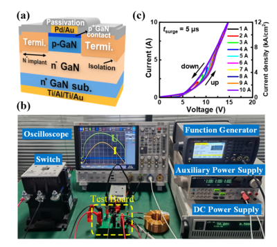 ͼ3. (a)±ÊÖ±GaN-on-GaN PiN¶þ¼«¹Ü£»(b)ÀËÓ¿²âÊÔÆ½Ì¨£»(c)ÀËÓ¿²âÊÔ½á¹û