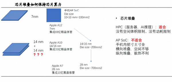 ´ó¹¦ºÄ¡¢¸ßËãÁ¦µÄ³¡¾°£¬ÏȽø·â×°/ChipletÓÐÓ¦ÓüÛÖµ ÔÚÏȽøÖƳ̲»¿É»ñµÃµÄÇé¿öÏ£¬Í¨¹ýоƬ¶Ñµþ£¨ÏȽø·âת/Chiplet£©ºÍÅÌËã¼Ü¹¹Öع¹£¬ÒÔά³Ö²úÆ·ÐÔÄÜ¡£ÒÔAPPLEµÄAϵÁÐоƬ²ÎÊýΪÀý£¬A12¡¢A10¡¢A7оƬ»®·Ö½ÓÄÉ7 nm¡¢14/16 nm£¨Samsung 14 nm¡¢TSMC 16 nm£©¡¢28 nmÖÆ³Ì¡£AϵÁеÄÊÖ»úAPоƬ£¬Í¨³£Ð¾Æ¬Ãæ»ý£¨Die Size£©ÔÚÔ¼100 mm2¾Þϸ¡£ÔÚÕâ100 mm2¾ÞϸµÄоƬÉÏ£¬ A12¡¢A10¡¢A7оƬ»®·Ö¼¯³ÉÁËÔ¼69ÒÚ¡¢33ÒÚ¡¢10Òڿž§Ìå¹Ü¡£ÏÂÃæ£¬ÎÒÃǼòµ¥½øÐÐËãÊõ»»Ë㣬ÌÖÂÛ½µÖƳÌÈçºÎά³ÖоƬµÄËãÁ¦¡£Èç¹ûоƬ¹¤ÒÕ´Ó7 nm½µÖÁ14 nm£¬A12оƬÉÏ7nm¹¤ÒÕ¼¯³É69Òڿž§Ìå¹Ü£¬Èç¹ûÓÃ14 nm¹¤ÒÕÒÔÊÔͼµÖ´ï½Ó½üµÄËãÁ¦£¬Ê×ÏÈÒª°ü¹Ü¾§Ìå¹ÜÊýÄ¿ÓëA12оƬһÖ£¬¼´~70ÒÚ¿Å£¬ÇÒÔÚδ¿¼ÂÇÖÆ³ÌÌáÉý¶Ôµ¥¸ö¾§Ìå¹ÜÐÔÄÜÓÐÏÔÖøÌáÉýµÄÅä¾°Ï£¬14 nm¹¤ÒÕµÄоƬÐèÒªÁ½±¶ÓÚ7 nm¹¤ÒÕµÄÃæ»ý£¬¼´~200 mm2£»Èç¹ûоƬ¹¤ÒÕ´Ó7 nm½µÖÁ28 nm£¬²Î¿¼28 nmµÄA7оƬֻ¼¯³ÉÁË10Òڿž§Ìå¹Ü£¬Èç¹ûÒªµÖ´ï70ÒÚ¾§Ìå¹ÜÊýÄ¿£¬ÔòÐèÒª½«Ð¾Æ¬Ãæ»ýÀ©´óÖÁ~700 mm2¡£Ð¾Æ¬Ãæ»ýÔ½´ó£¬¹¤ÒÕÁ¼ÂÊÔ½µÍ£¬ÔÚʵ¼ÊÖÆÔìÖлñµÃµÄµ¥¿ÅоƬµÄÖÆÔ챾Ǯ¾ÍÔ½¸ß£¬Òò´Ë£¬ÔÚÏȽøÖƳ̲»¿É»ñµÃµÄÅä¾°Ï£¬½µÖƳ̶øÍ¨¹ýоƬ¶ÑµþµÄ·½·¨£¬¼òÖ±¿ÉÒÔÒ»¶¨Ë®Æ½¼õÉÙËãÁ¦ÁÓÊÆ£¬¿ÉÊÇÒòΪ¶Ñµþ¸ü¶àоƬ£¬ÐèÒª¸ü´óµÄICÔØ°å¡¢¸ü¶àµÄChipletСоƬ¡¢¸ü¶àµÄ·â×°ÖÊÁÏ£¬Ò²µ¼ÖÂÒòÎªÖÆ³ÌÂäºó´øÀ´µÄ¹¦ºÄÔö´ó¡¢Ìå»ý/Ãæ»ýÔö¼Ó¡¢±¾Ç®µÄÔö¼Ó¡£Òò´Ë£¬ºÃ±È£¬Í¨¹ý14 nmµÄÁ½¿ÅоƬ¶Ñµþ£¬È¥µÖ´ïͬÑù¾§Ìå¹ÜÊýÄ¿µÄ7 nmоƬÐÔÄÜ£»Í¨¹ý¶à¿Å28 nmµÄоƬ¶Ñµþ£¬È¥µÖ´ï14 nmоƬÐÔÄÜ¡£´ËÖֶѵþ¼Æ»®ÔÚHPC£¨Ð§ÀÍÆ÷¡¢AIÍÆÀí£©¡¢»ùÕ¾Àà´óоƬÁìÓò¿ÉÄÜÓÐÊÊÓüÛÖµ£¬µ«¹ØÓÚÏû·Ñµç×ÓÁìÓòÈçÊÖ»úAPоƬºÍ¿ÉÒÂ×ÅоƬ£¬ÔÚÆäÓ¦Óó¡¾°¶Ô¿Õ¼äÌå»ýÓÐÑÏ¿ÁÔ¼ÊøµÄÌõ¼þÏ£¬Ð¾Æ¬¶ÑµþÔò½ÏÄÑʩչ¡£