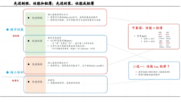 ÔÚ¸ßÐÔÄܺÍÇᱡ»¯Á½¸öÆ«ÏòÉÏ£¬ÏȽøÖƳ̿ÉÒÔ×öµ½¼æ¹Ë£¬¶øÏȽø·â×°ÔòÓÐÈ¡Éá¡£ºÃ±È£¬APPLEµÄAϵÁÐоƬ£¬´ÓA10Éý¼¶µ½A11ʱ£¬ÓÉ16 nm¹¤ÒÕÌáÉýÖÁ10 nm¹¤ÒÕ£¬Ð¾Æ¬Ãæ»ý´Ó125 mm2¼õСÖÁ88 mm2£¬¶ø¾§Ìå¹Ü¼¯³ÉÊýÔòÓÉ33ÒÚ¿ÅÔö¼ÓÖÁ43ÒÚ¿Å£»AϵÁÐоƬ´ÓA13Éý¼¶µ½A14ʱ£¬¾§Ô²¹¤ÒÕ´Ó7nmÉý¼¶µ½5nm£¬Ð¾Æ¬Ãæ»ý´Ó98 mm2¼õСÖÁ88 mm2£¬¶ø¾§Ìå¹Ü¼¯³ÉÊýÔòÓÉ85ÒÚ¿ÅÔö¼ÓÖÁ118ÒÚ¿Å£¬×öµ½ÁËÐÔÄÜÌáÉýºÍÇᱡ»¯µÄ¼æ¹Ë¡£¶øÏȽø·â×°£¬Òª×öµ½Ð¾Æ¬ÐÔÄÜÌáÉý£¬ÒòΪ·â×°¶Ô¾§Ìå¹Ü³ß´ç΢ËõûÓÐЧ¹û£¬ÌáÉýÐÔÄÜÒ»ÊÇÔö¼ÓоƬÄÚ²¿¸÷Ôª¼þµÄÐ×÷ЧÂÊ£¬¶þÊÇÍùÒ»¸öϵͳÖжѵþ¸ü¶àµÄÔª¼þ£¨ÊµÖÊÉÏÒ²ÊÇÌáÉýÁËϵͳÄڵľ§Ìå¹ÜÊý¾Ý£©£¬¼ÛÇ®¾ÍÊÇϵͳÌå»ý¡¢Ãæ»ý¸üΪÅӴ󣬼´ÏȽø·â×°ÌáÉýÐÔÄܵļÛÇ®ÊÇÎþÉüÇᱡ£¬ÊµÏÖÇᱡµÄ¼ÛÇ®ÊÇÎþÉüÐÔÄܵÄÌáÉý¡£
