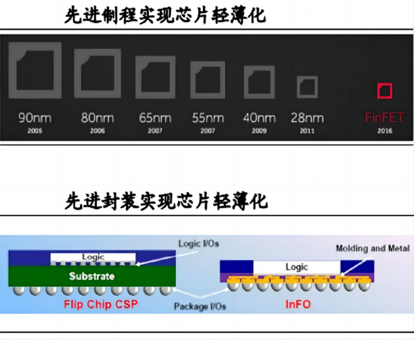 ÔÚоƬÇᱡ»¯·½Ã棬ÔÚ²»ÎþÉüоƬÕûÌåÐÔÄܵÄǰÌáÏ£¬ÏȽøÖƳÌÄܹ»ÔÚËãÁ¦ºÍ¾§Ìå¹ÜÊýÄ¿ÎÈ׼ʱ£¬Í¨¹ýËõСµ¥¸ö¾§Ìå¹ÜÌØÕ÷³ß´ç£¬ÊµÏÖÐ¾Æ¬Ãæ»ý(Die size)ËõС£»¶øÏȽø·â×°£¬ÒòΪ·â×°¶Ô¾§Ìå¹Ü³ß´çÎÞ΢ËõµÄÄÜÁ¦£¬Ö»ÄÜͨ¹ý¸ü¾«Ï¸µÄÖÊÁÏ¡¢¸üÖÂÃܵĽṹÀ´ÊµÏÖÇᱡ»¯¡£ºÃ±È£¬ÊÖ»úAP´¦ÀíÆ÷µÄ·â×°¶à½ÓÄÉFCCSPµÄ·â×°ÐÎʽ£¬Æä½á¹¹°üÀ¨Ò»¸öCSPÔØ°å£¬¶øFanout£¨TSMCÓëAPPLE¹«Ë¾ÏàÖú£¬APPLE¹«Ë¾µÄAϵÁÐоƬ¶à½ÓÄÉInFO¼¼Êõ·â×°£¬¼´Fannout£©·â×°£¬È¡ÏûÁËCSPÔØ°å£¨CSPÔØ°åÔ¼0.3 mmºñ¶È£©£¬·â×°ºóµÄоƬ¸üÇᱡ£¬¶ÔÕû»ú£¨ÊÖ»ú£©½á¹¹¿Õ¼äÓàÁ¿ÓÐÖØÒªÌáÉý¡£