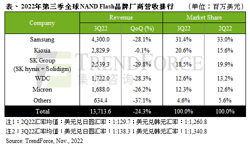 NAND Flash³§ÉÌÅÅÃû£»°ëµ¼ÌåÏîĿнøÕ¹Ðû²¼Ê±¼ä£º2022-12-01 00:24À´Ô´£ºÈ«Çò°ëµ¼ÌåÊÓ²ì È«Çò°ëµ¼ÌåÊÓ²ì 1 ¾ÝTrendForce¼¯°î×Éѯͳ¼Æ£¬µÚÈý¼¾¹©Ó¦ÉÌλԪ³ö»õÁ¿»·±È¼õÉÙ6.7%£¬Æ½¾ùÏúÊÛµ¥¼ÛÁ¬ÐøÏµø£¬ÕûÌåNAND Flash¹¤ÒµÓªÊÕÔ¼137.1ÒÚÃÀÔª£¬»·±ÈË¥ÍË·ù¶È¸ß´ï24.3%¡£